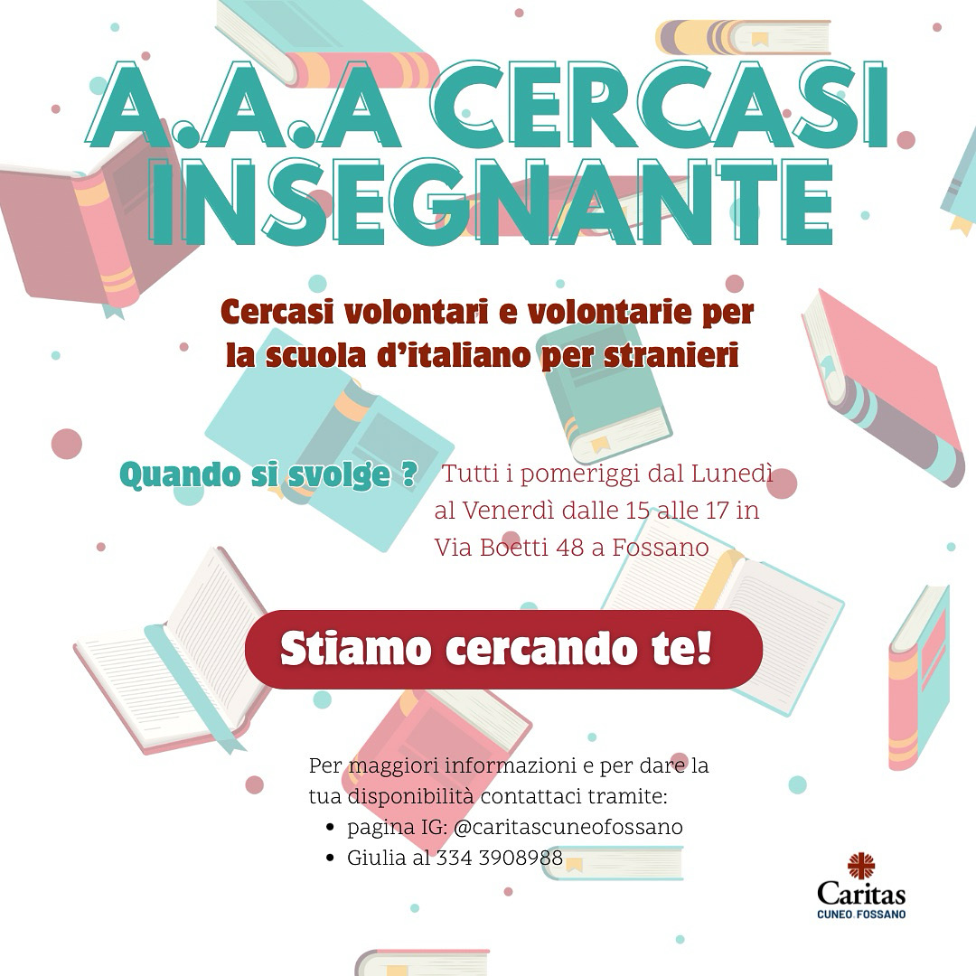 Siamo alla ricerca di nuove forze di volontari e volontarie per la scuola d’italiano per stranieri che si tiene a Fossano in Via Boetti 48 accanto al Centro di Ascolto della Caritas.